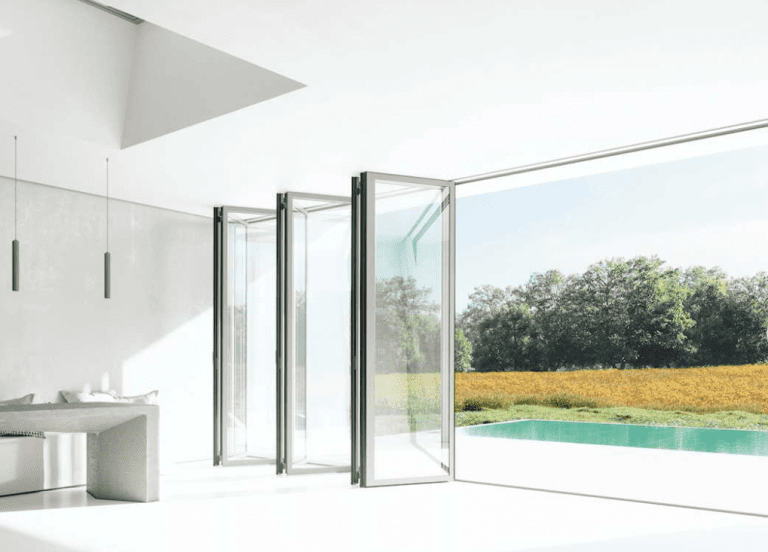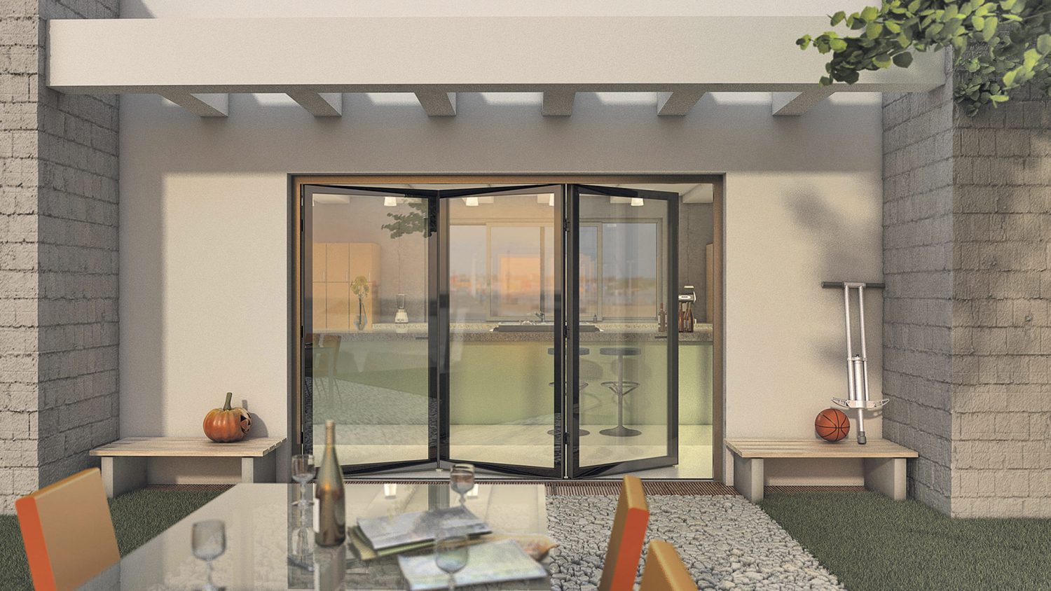 Iverco présente un système de menuiseries permettant de réaliser des portes repliables aluminium auto portées (de 2 à 8 vantaux) à rupture de pont thermique, avec ouverture intérieure ou extérieure. Parfaitement étanche (classement à l’eau supérieur à 9) et garantissant une parfaite sécurité (verrouillage 3 points à clés sur le battant et verrouillage haut et bas sur les parties repliables), ce nouveau système de porte repliable permet une ouverture totale des espaces en prolongeant les pièces à vivre vers l’extérieur!